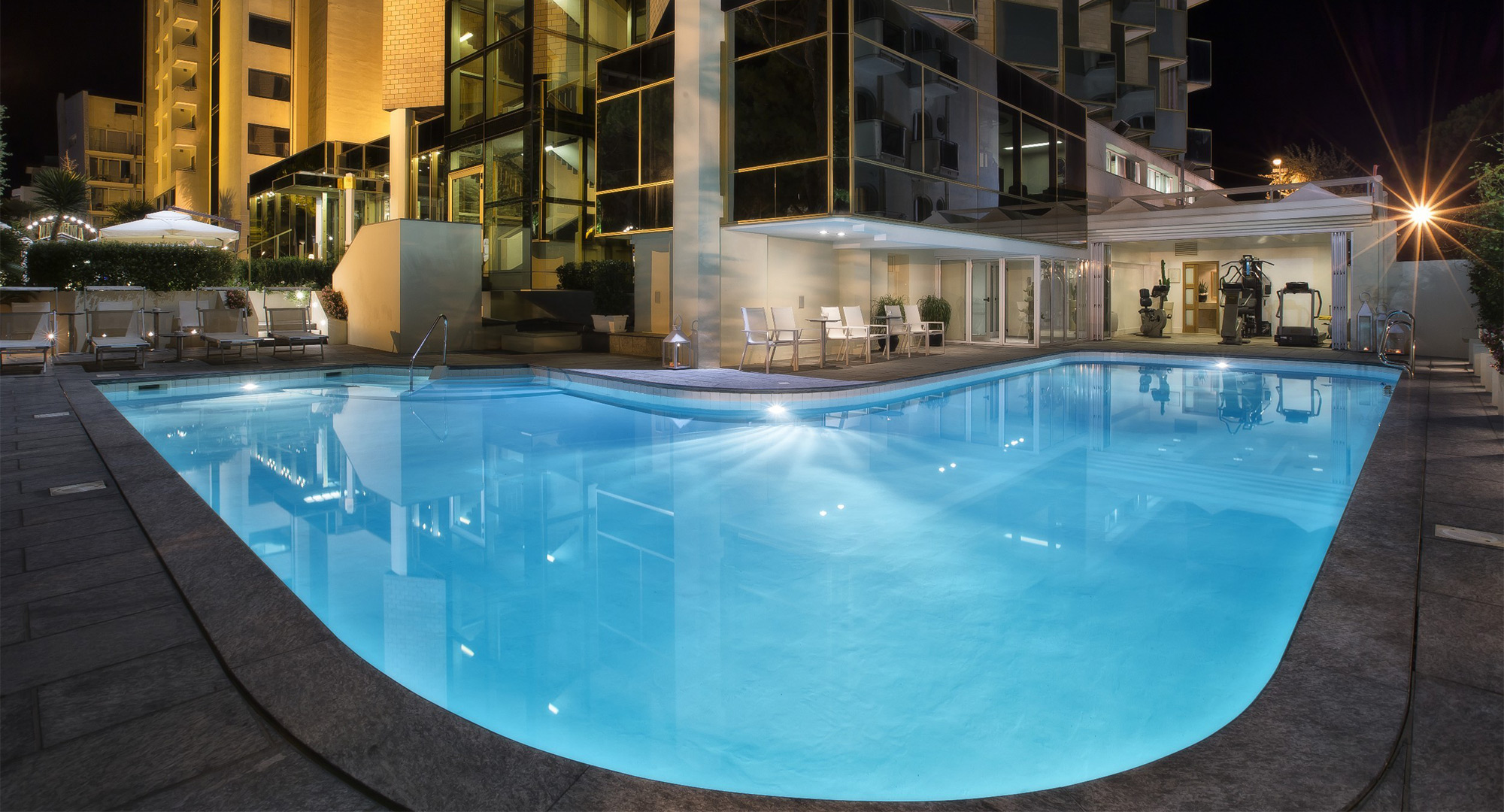 Moderna ed elegante struttura sul lungomare di Rimini, dispone di 62 camere e suite con vista mare, una piscina riscaldata con 2 zone idromassaggio, un centro congressi ed un’area fitness e benessere.